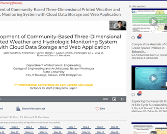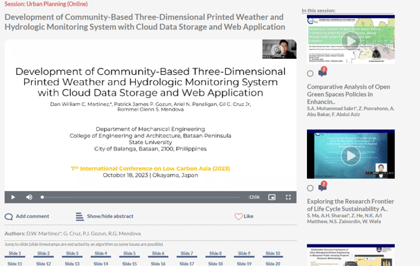 Presented online the research study entitled “Development of Community-Based Three-Dimensional Printed Weather and Hydrologic Monitoring System with Cloud Data Storage and Web Application” which is published in Chemical Engineering Transactions Jorunal on December 2023.